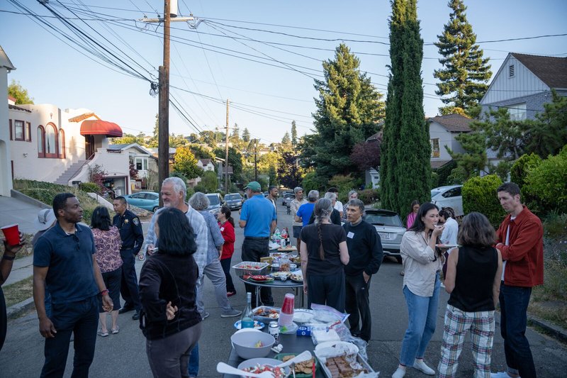 Residents gather at a 2025 National Night Out block party on Boulevard Way at the Oakland-Piedmont border. Credit: Florence Middleton for The Oaklandside, a publication of grantee Cityside Journalism.