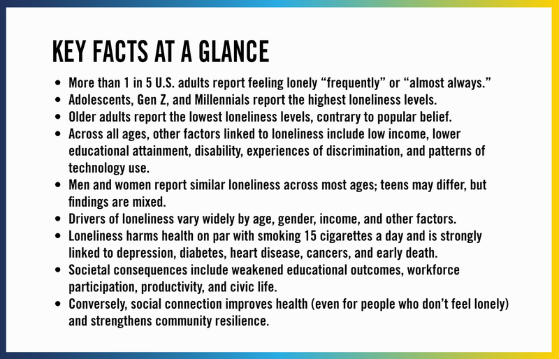 As people move further into adulthood, loneliness tends to show up differently: through work stress, caregiving, geographic mobility, or the gradual thinning of friendships over time. But the early patterns set in adolescence and young adulthood matter. Disconnection at these stages can shape how people approach relationships for years to come, influencing trust, confidence, and civic engagement, as well as stress levels, mental health, and overall well-being. In that sense, it is not just a passing phase but both a personal health risk and an early signal of how the social fabric itself may fray if connection is not made easier, deeper, and more durable.