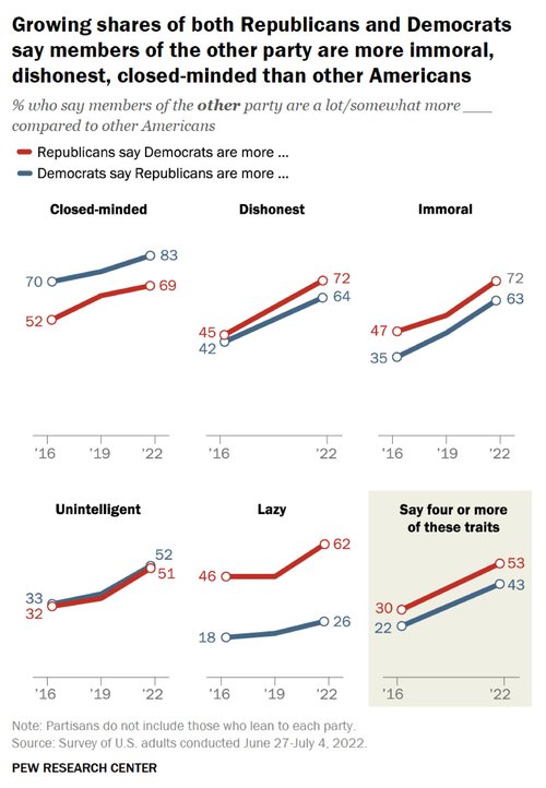 The cleaving of the parties along important racial and cultural identities has sharpened partisan hostilities. Negative feelings towards members of the opposing party have increased steadily since the late 1970s. Political polarization has penetrated our social worlds, with an increasing number of Americans unwilling to date or marry someone who does not share their political views. Research surveys have shown that a large segment of the public views the other party as a serious threat to the country and its people3 (though, importantly, Americans also tend to overestimate the extremism of members of the opposing party).