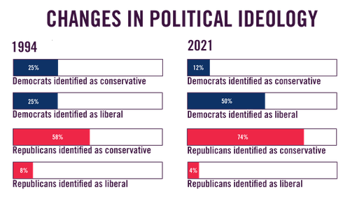 The sorting of partisan politics along these overlapping sets of identities is the result of a decades-long political realignment in which ideologically and religiously conservative white voters, especially in the South, shifted their allegiance from the Democratic to the Republican Party. This realignment was a response to political movements of the 1960s and 70s, including the Civil Rights Movement, that challenged the country’s longstanding racial and gender hierarchies and cultural norms. The Republican Party strategically courted voters who were anxious about these societal changes, while racially and ideologically progressive voters made their home in the Democratic Party. The result today is two political parties that are much more ideologically polarized than they were 50 years ago2.